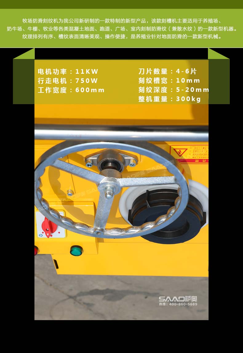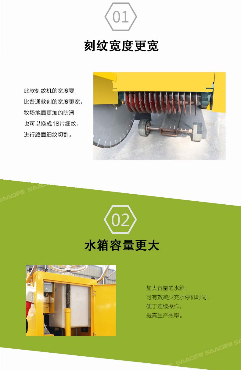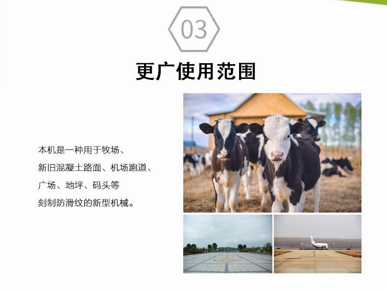 牧场防滑刻纹机为我公司新研制的一款特制的新型产品,该款刻槽机主要适用于养殖场、奶牛场、牛棚、牧业等各类混凝土地面、跑道、广场、室内刻制防滑纹(兼散水纹)的一款新型机器。纹理排列有序、槽纹表面清晰美观、操作便捷,是养殖业针对地面防滑的一款新型机械。