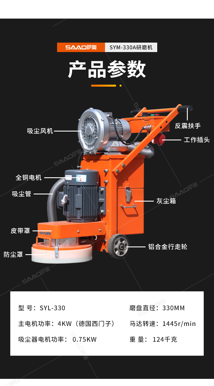 SYM-330手推式无尘地面研磨机,是集研磨和吸尘为一体的先进的路面机器,边打磨边吸尘,为我们提供良好的无尘打磨环境。特别是在地面混凝土强度低的情况,如果配上砂纸磨片,也可以打磨环氧腻子层;同时对环氧腻子层的磨损小,提高环氧地面的平整度。
