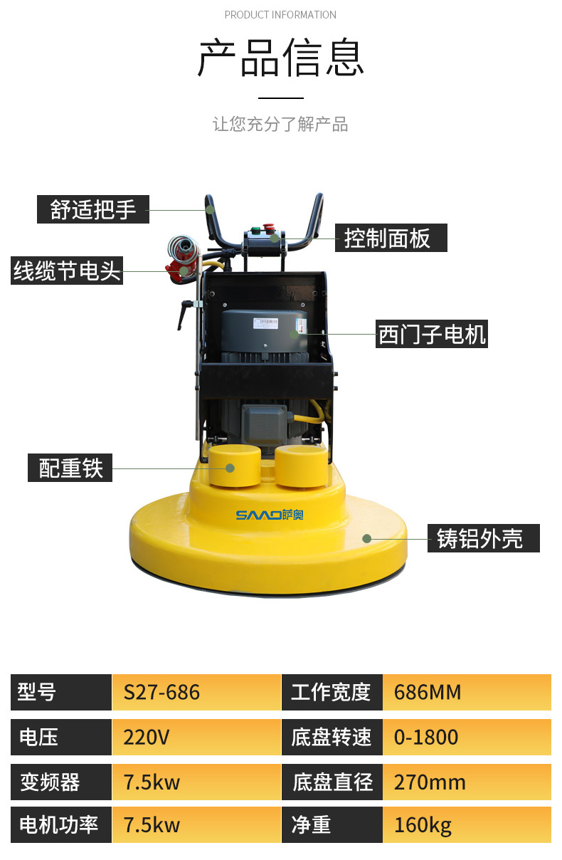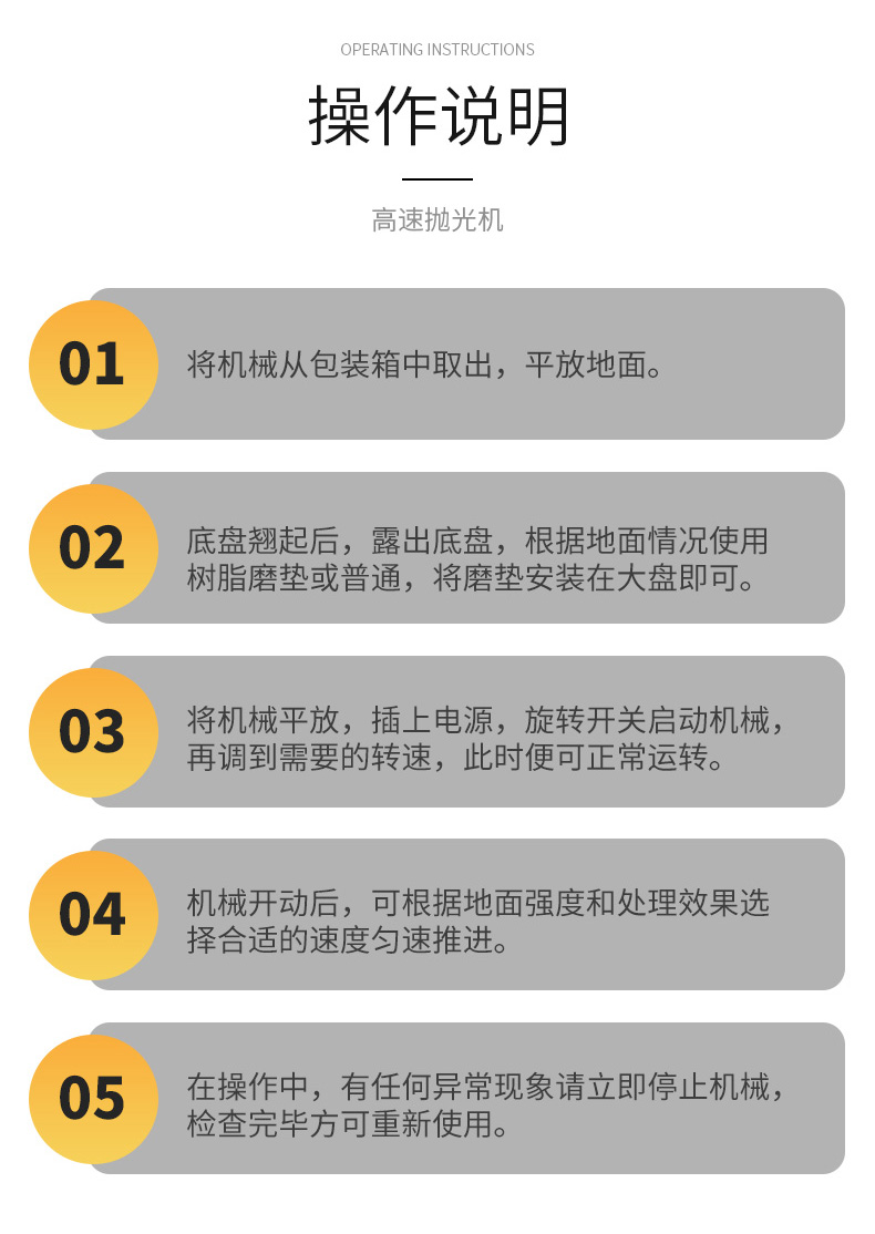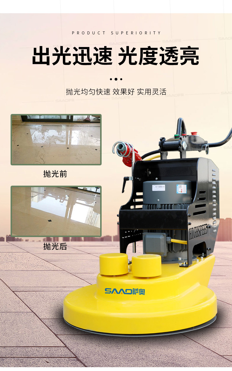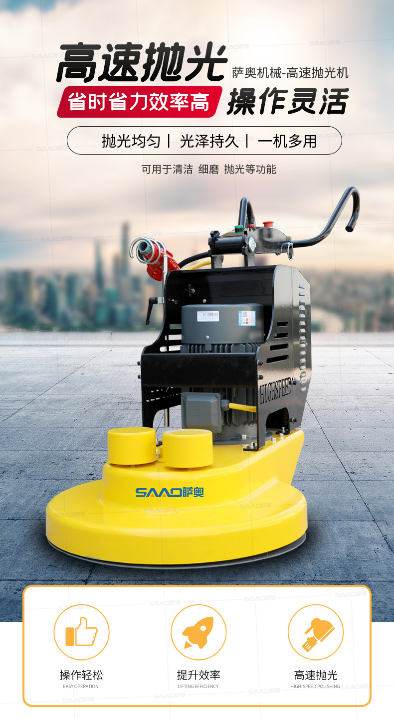 产品介绍: 高速抛光机是最具有竞争力的地坪机型系列。长期占据可观的市场份额。其广泛用于固化地面,石材地面的抛光,最终使得地面产生高洁,持久的光泽。 产品展示图: 产品