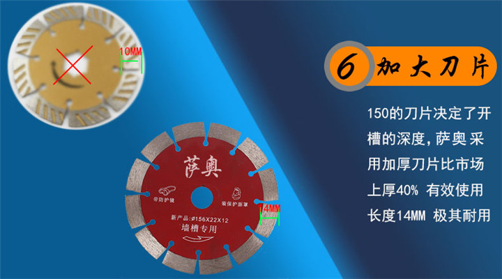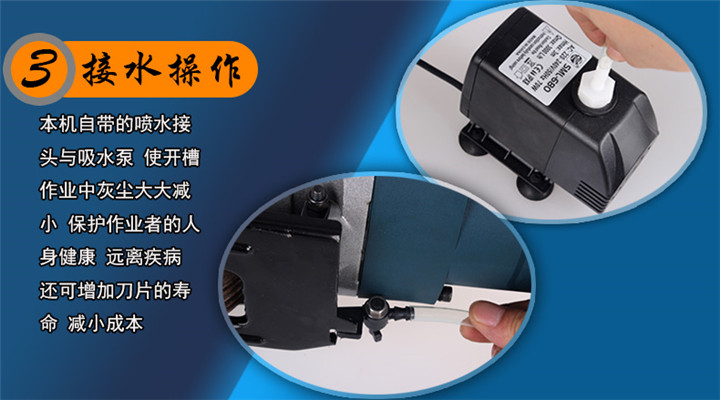 3、健康环保:自带的喷水与水泵,是开槽作业中的吹尘大大减少,保护作业者的人身健康,远离疾病还可以增加刀片的寿命,减少成本。