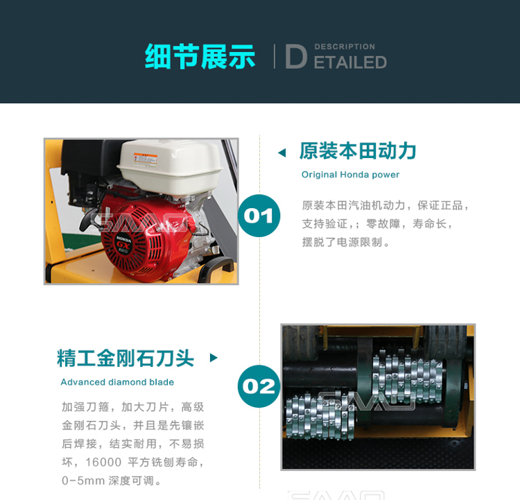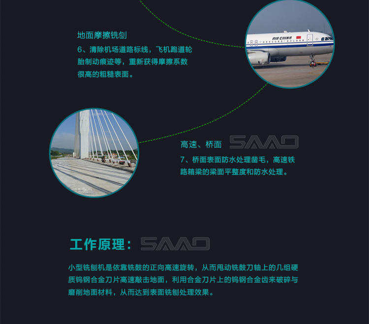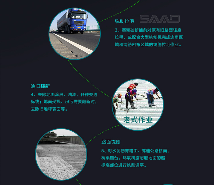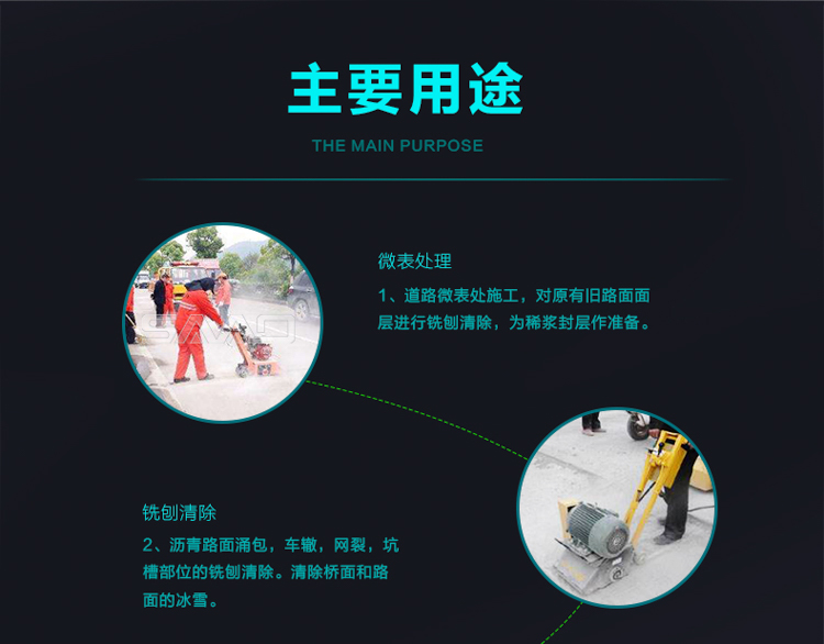 用于桥面铺设沥青或车间旧的混凝土地面重新摊铺混凝土之前,清除水泥浮浆以及铲平拉毛,也用于清除建筑施工中遗留的坚硬灰渣。