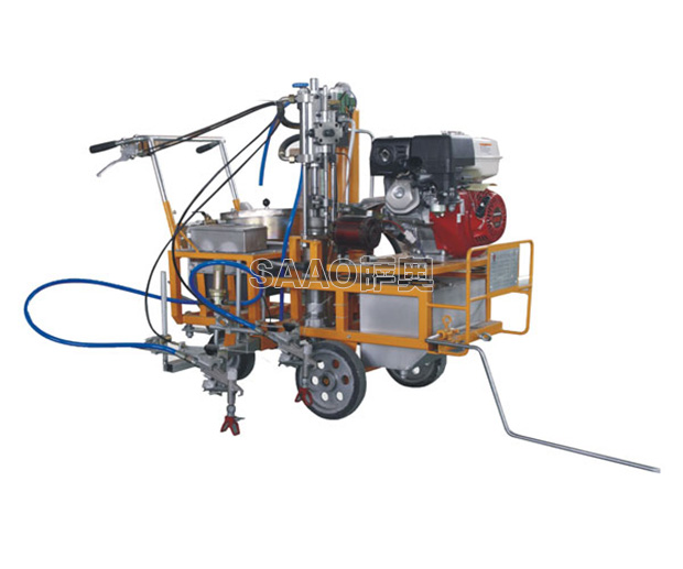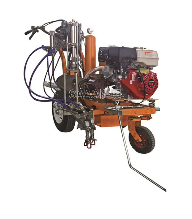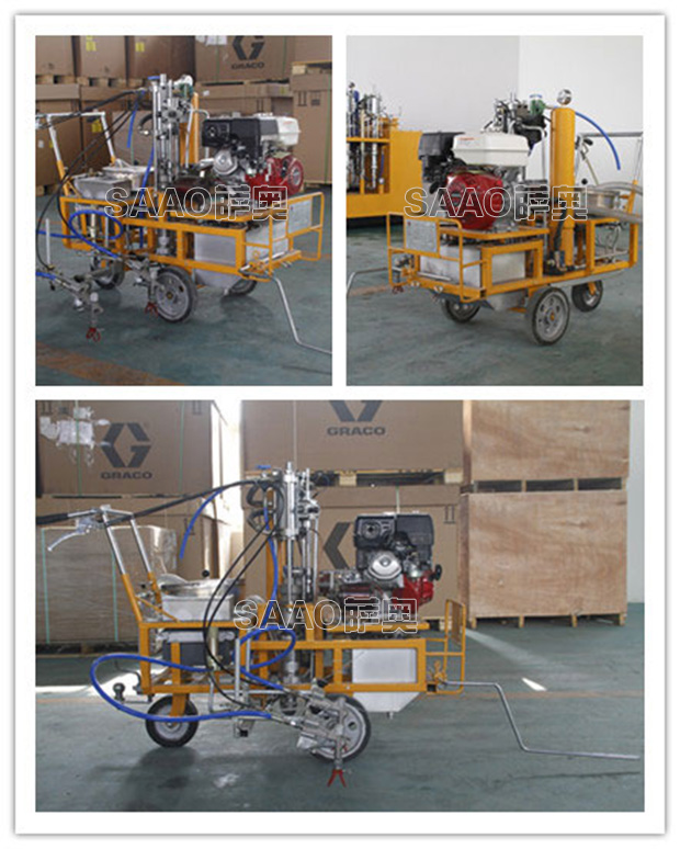 手推车载两用冷喷划线机为高雅力等流量型无气喷涂机,该机利用汽油机驱动单柱塞泵,是涂料在机内形成高压进行喷涂,所以划线厚薄均匀角齐,喷枪架导向杆升降设计