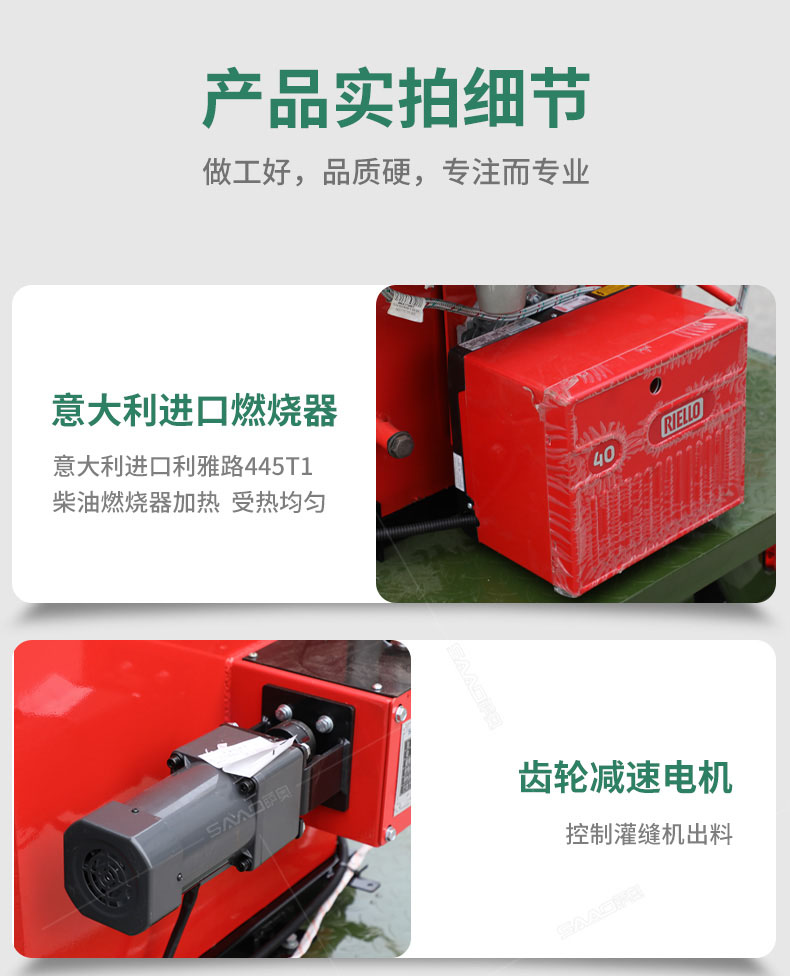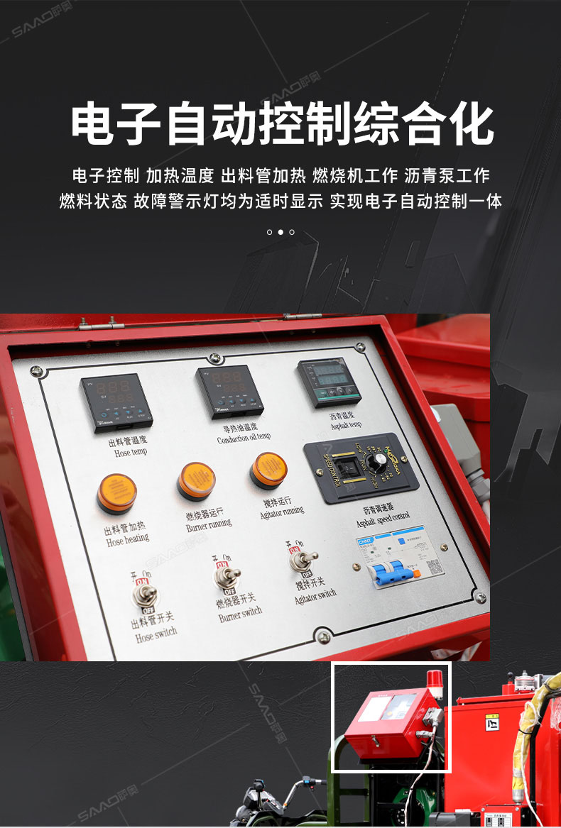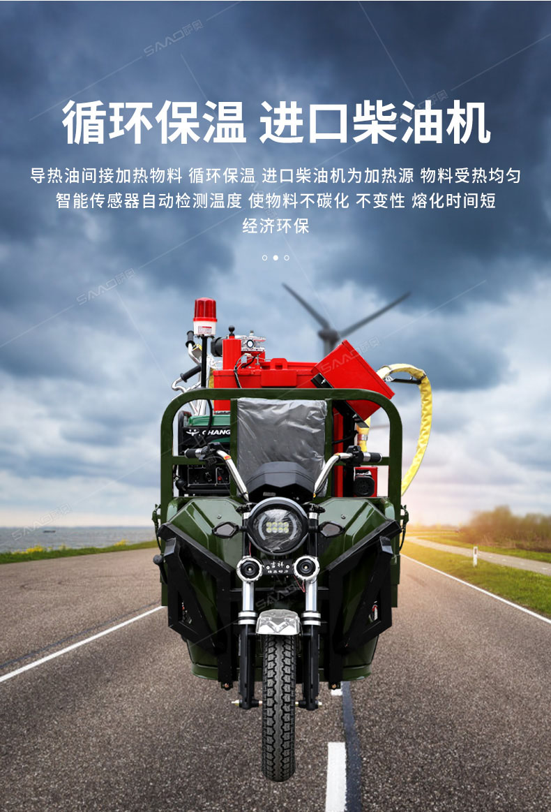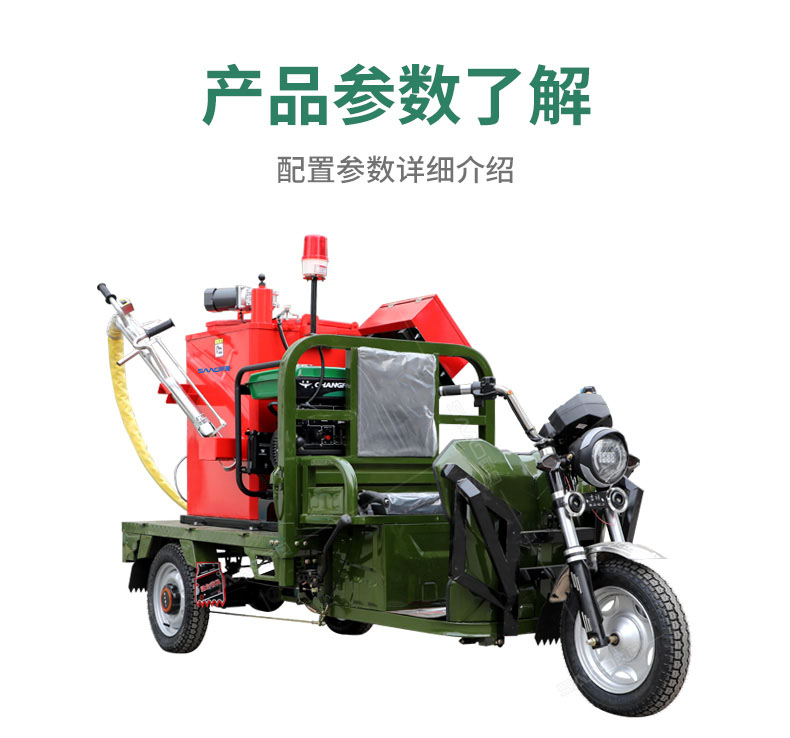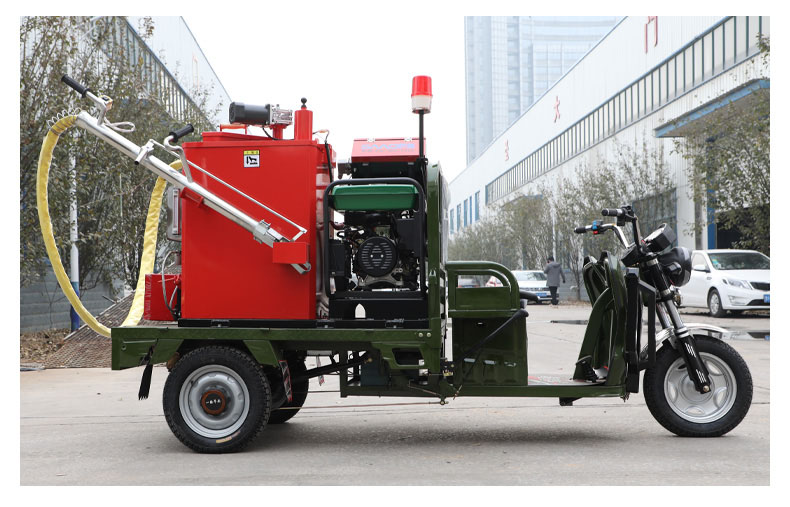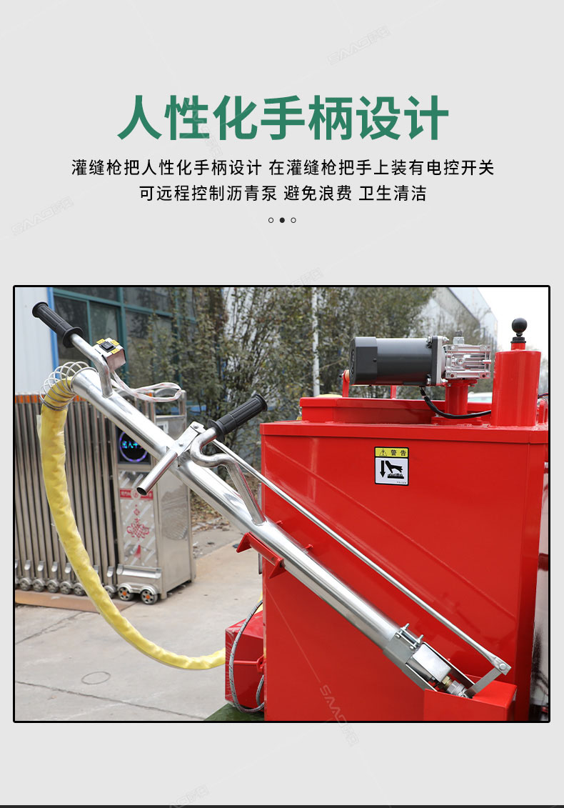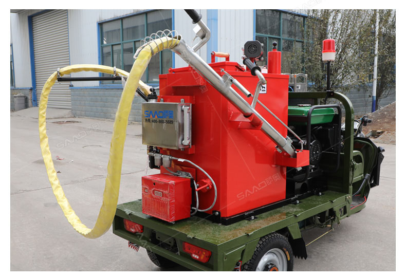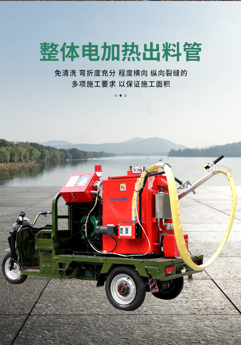 汽油灌缝机主要有手推式和自行式手持灌缝管操作,采用进口柴油燃烧器加热。在工作时首先在料箱内加入沥青或灌缝胶,启动发电机供电,依次间断打开导热油泵开关,燃烧器开关,出料管加热开关;调整自动温控系统与材料的温度相同,通过柴油燃烧器自动加热熔料箱内导热油开始升温(拖式为强制循环)使材料融化,温度是通过自控系统来控制。溶料时间大约30-40分钟左右。在材料融化、出料管温度达到后可以进行工作。手持灌缝管对正裂缝灌缝处理。沥青泵的出料流量可调。在工作过程中随时添加材料保证工作的连续性。