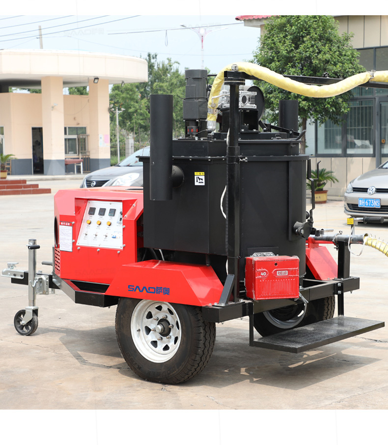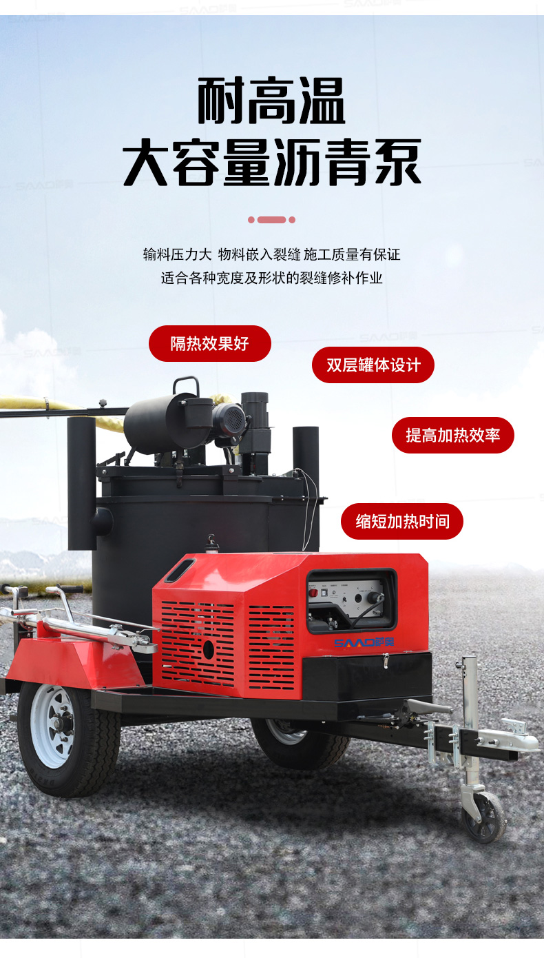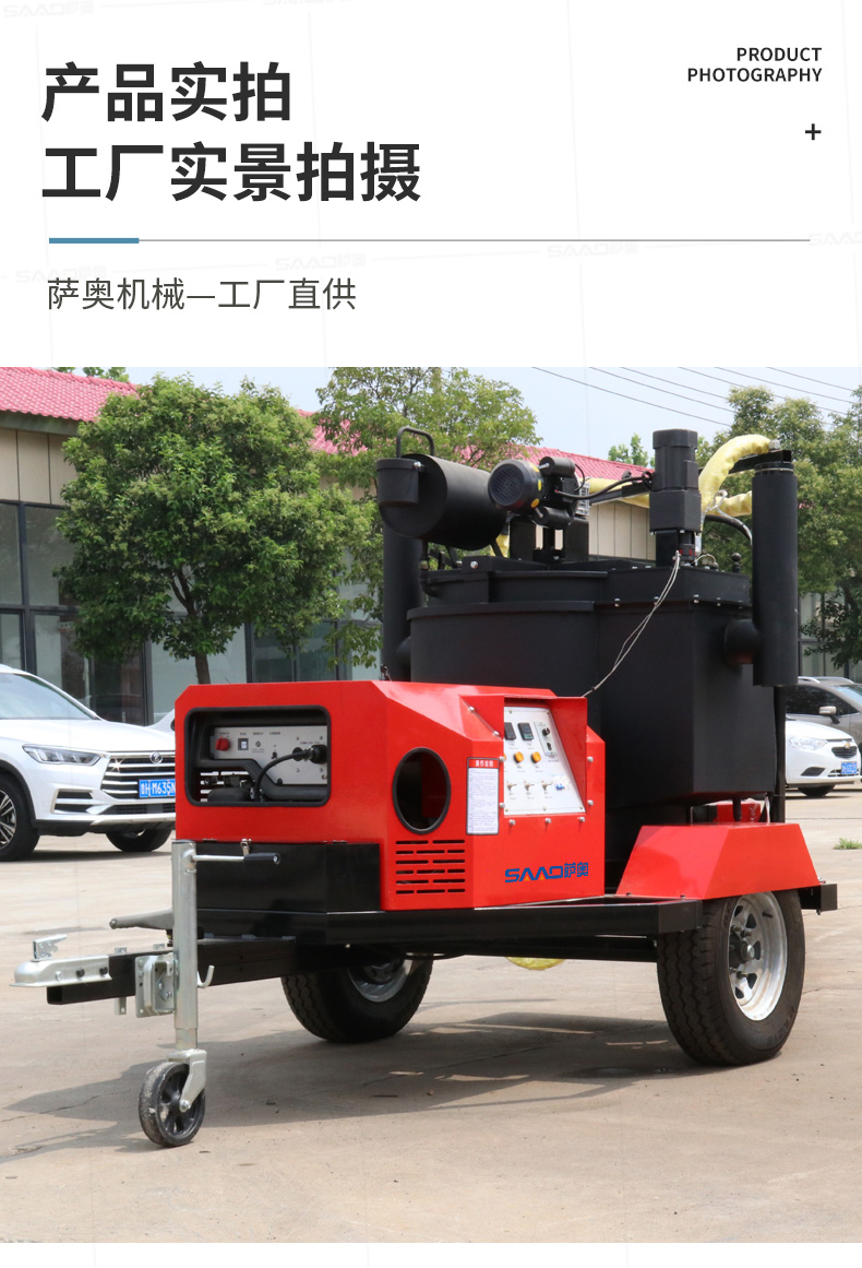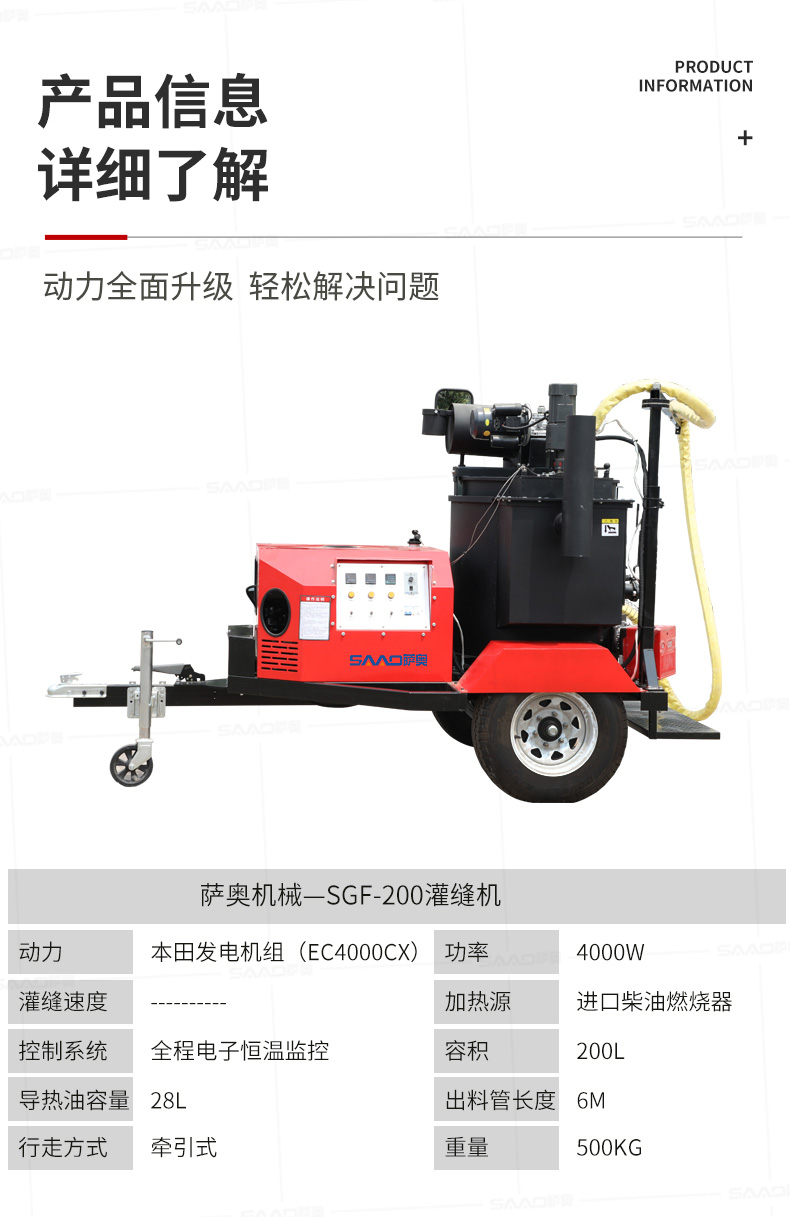 【产品介绍】 200升沥青灌缝机适用于沥青路面或水泥路面裂缝密封灌缝,是中型路面裂缝养护工程量施工理想设备。 自主研发生产,拥有自主知识产权的萨奥品牌,沥青灌缝机,使用