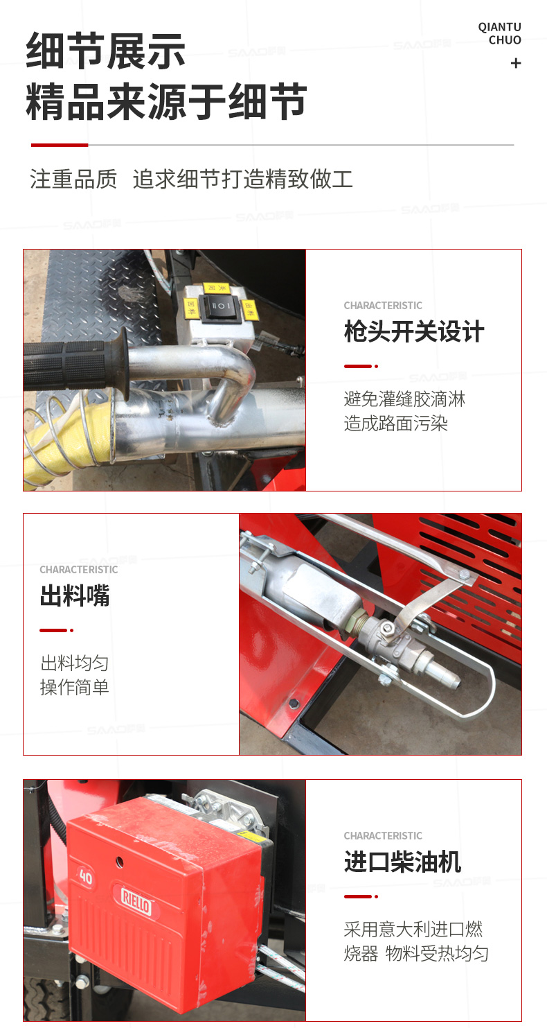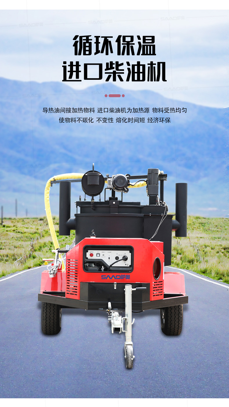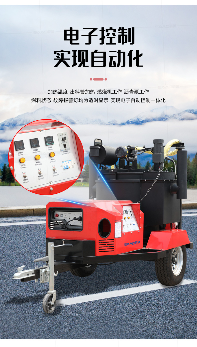 【产品介绍】 200升沥青灌缝机适用于沥青路面或水泥路面裂缝密封灌缝,是中型路面裂缝养护工程量施工理想设备。 自主研发生产,拥有自主知识产权的萨奥品牌,沥青灌缝机,使用