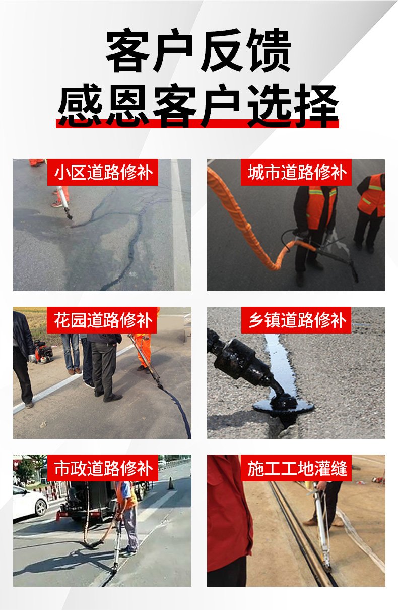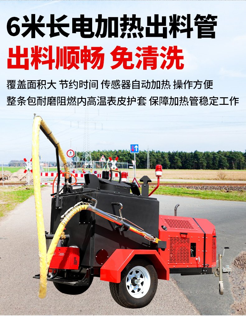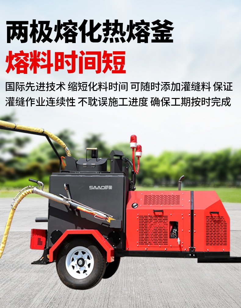 主要功能:通过一根单独的加热软管将加热融化后的橡胶沥青基密封材料连续注入清理过的缝隙完成裂缝病害密封处理。辅助灌缝设备完成裂缝密封的设备有(开槽机、热风枪),密封材料主要是沥青基橡胶密封胶。