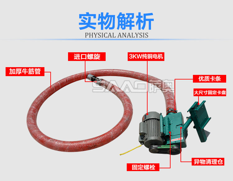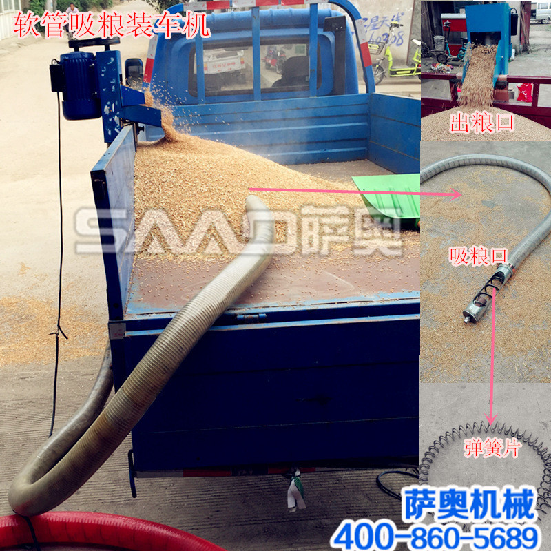答:是螺旋式的,软管里面有软螺旋,高速旋转把粮食提上来。管是软的不会对粮食造成损伤。