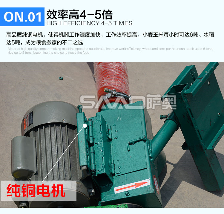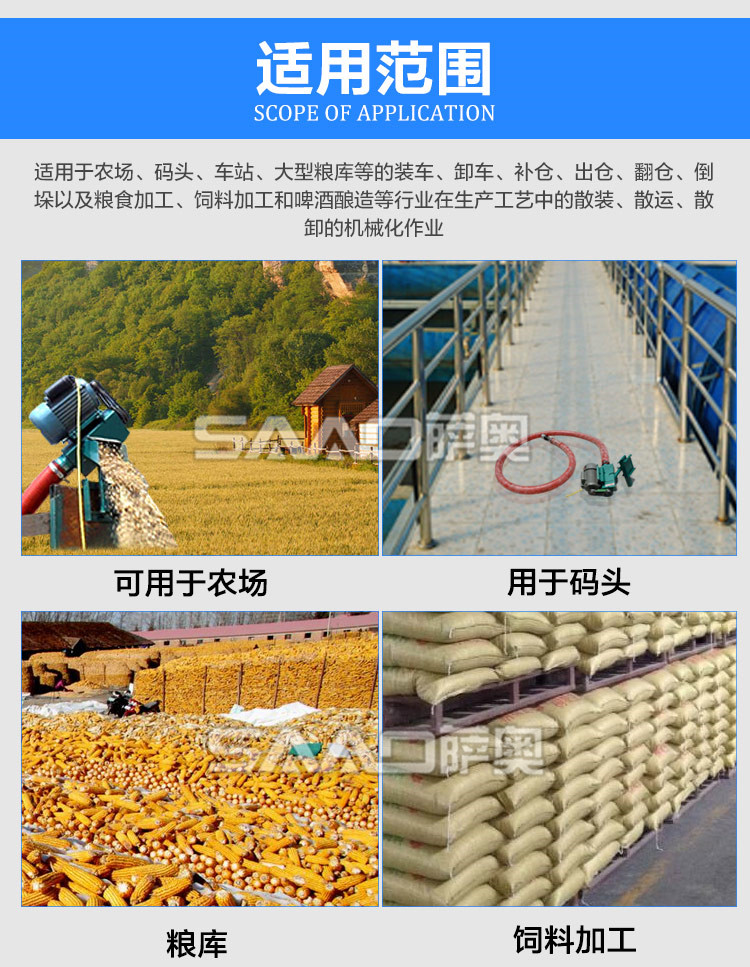 车载小型吸粮机是专门为农村运粮、装车、倒垛、仓储而设计 的一种小型设备,具有体积小、重量轻、便于移动、吸粮效率高、破损率低,使用场合广泛,安全可靠等特点,非常适合个体农户,粮食专业户及农业合作社使用。亦可以用在养殖场,饲料厂、食品厂、塑料厂等输送颗料的场合。