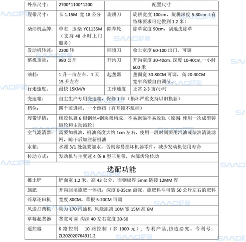 选配:推土铲、施肥器、打药机、碎草机等