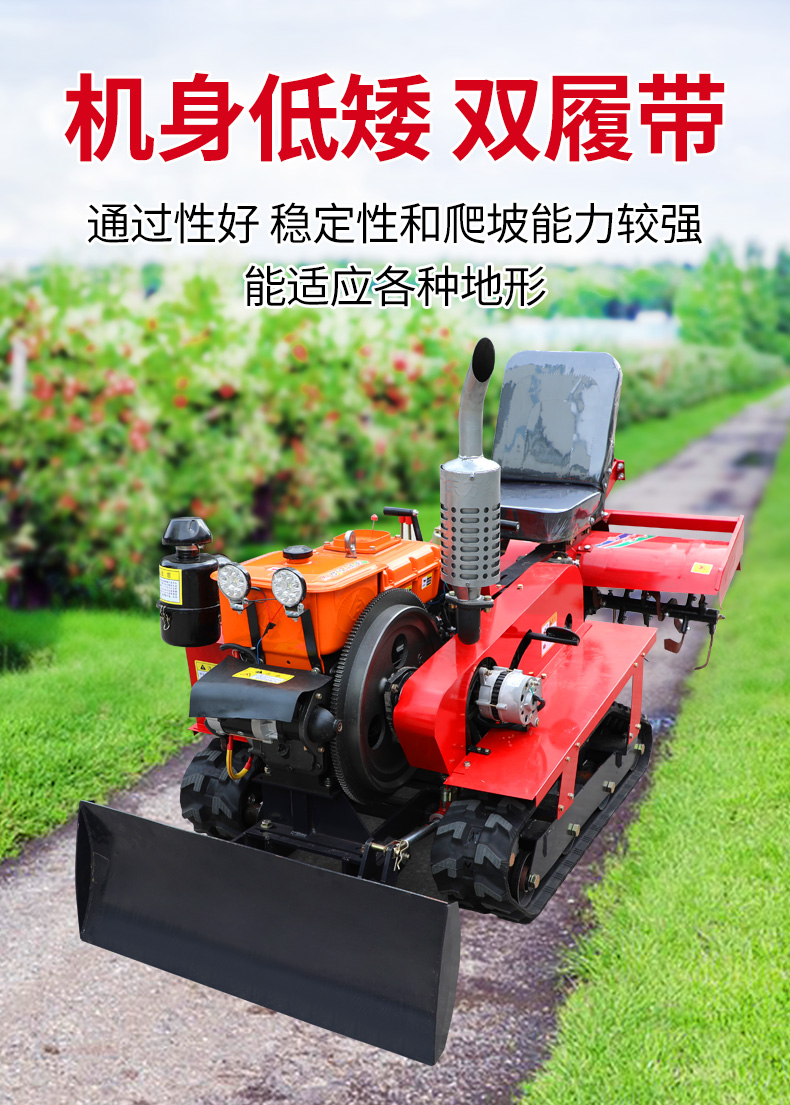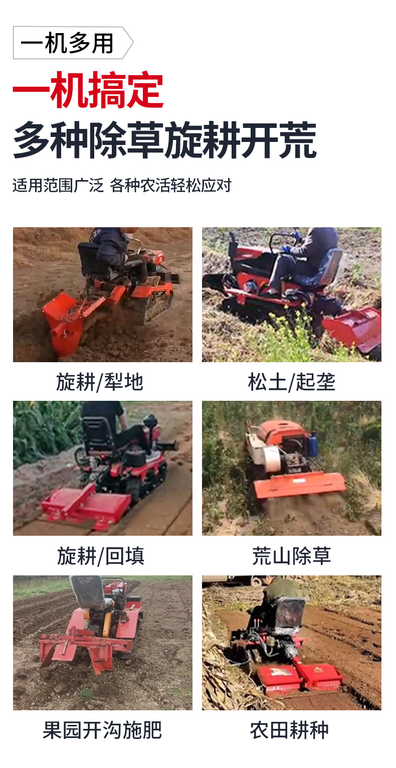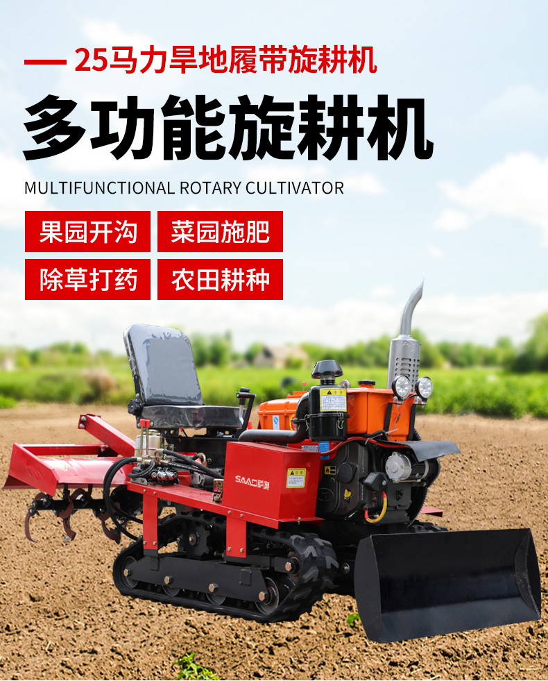 25马力旱地履带旋耕机适用于大面积、小面积清除杂草,适用于果园、农田、玉米地、山地的除草作业,打药/旋耕/犁地/开沟施肥/回填/除草/起垄都可以。