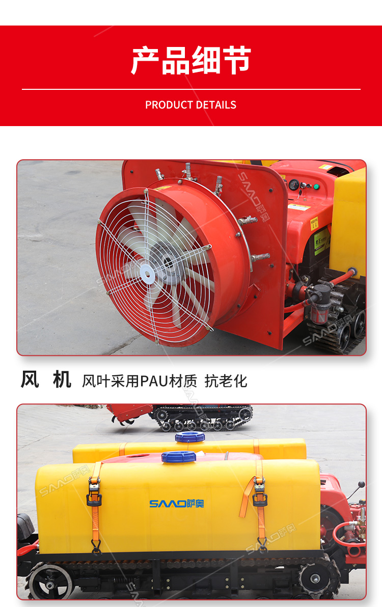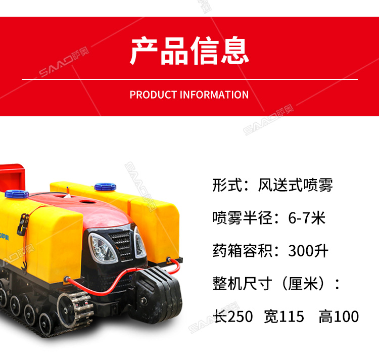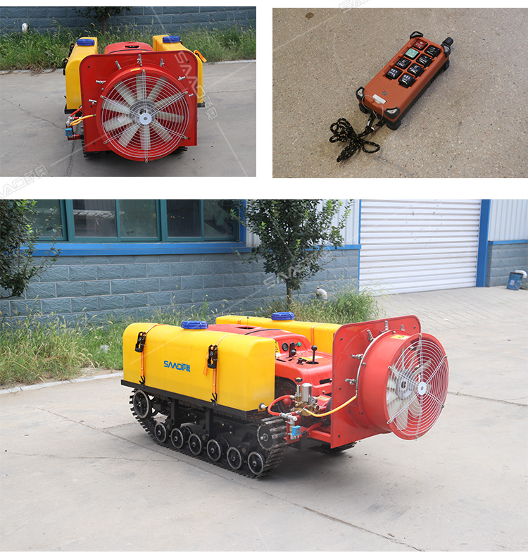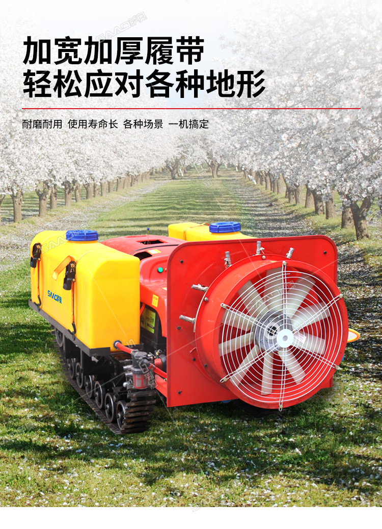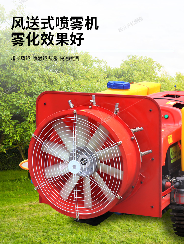 28马力钢履带自行式打药机,风送式喷雾机,雾化好,喷射距离远;遥控操作,人机分离,确保作业人员安全,免受药雾伤害。