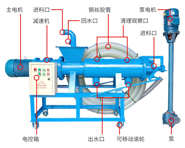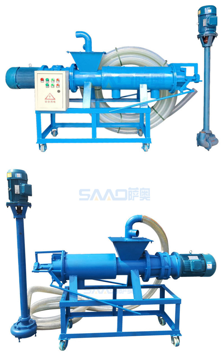 禽畜类粪便处理机能将鸡粪、牛粪、猪粪等禽畜粪便原粪水分离为液态有机肥和固态有机肥。液态有机肥可直接用于农作物利用吸收,固态有机肥可运到缺肥地区使用,也可起到改善土壤结构的作用,同时经过发酵可制成有机复合肥。用泥浆泵将原粪水送至机内,通过安置在筛网中的螺旋轴,挤压分离出固态物质,液体则通过筛网从出液口流出。