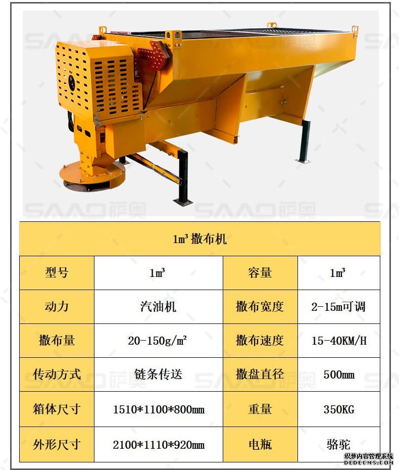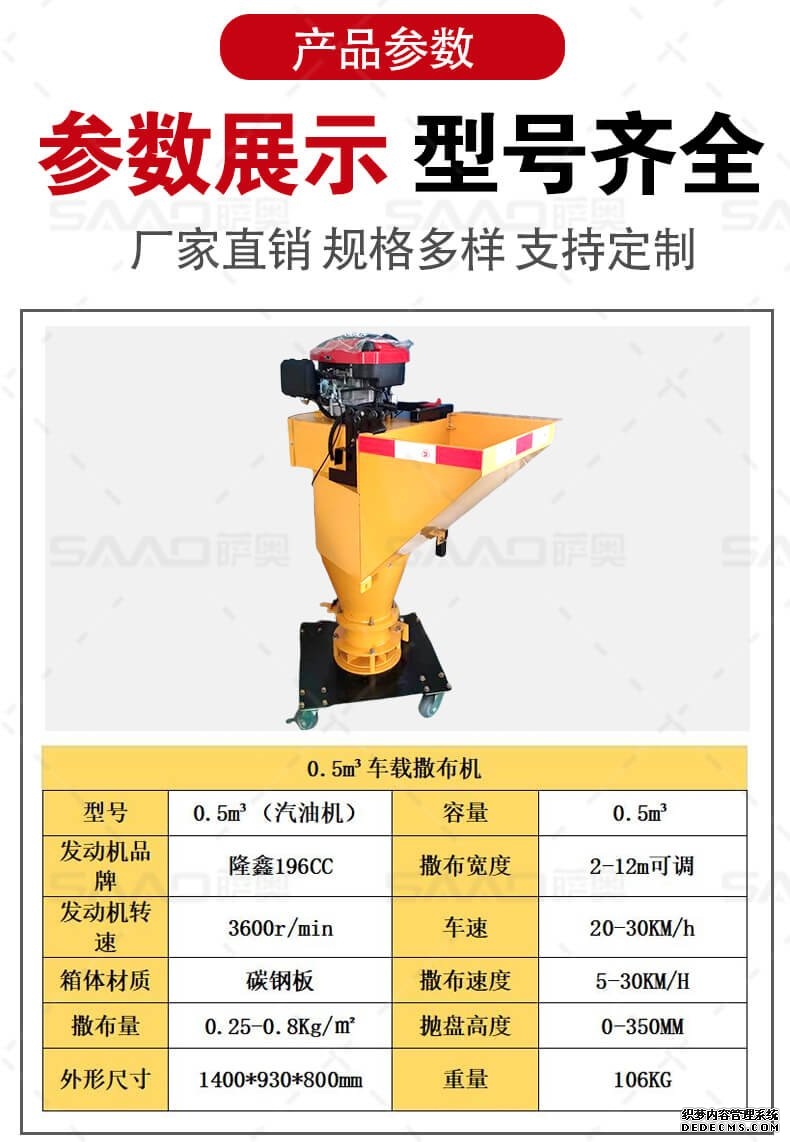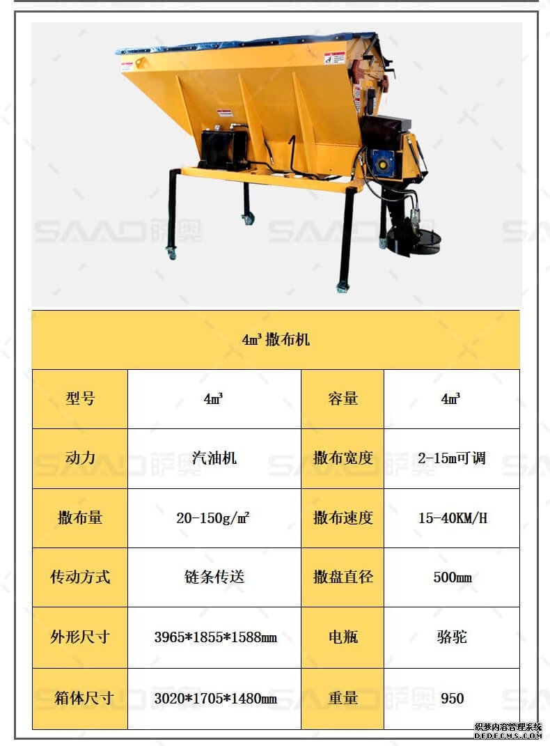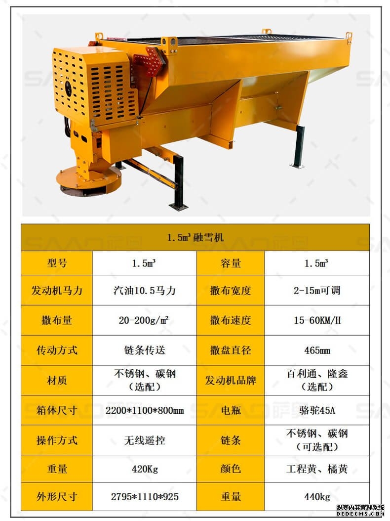 融雪剂撒布机是车载式撒布机,适用于冰雪路面防滑沙料和融雪剂的撒布,是市政公路、高速公路的融雪撒布的便利设备。