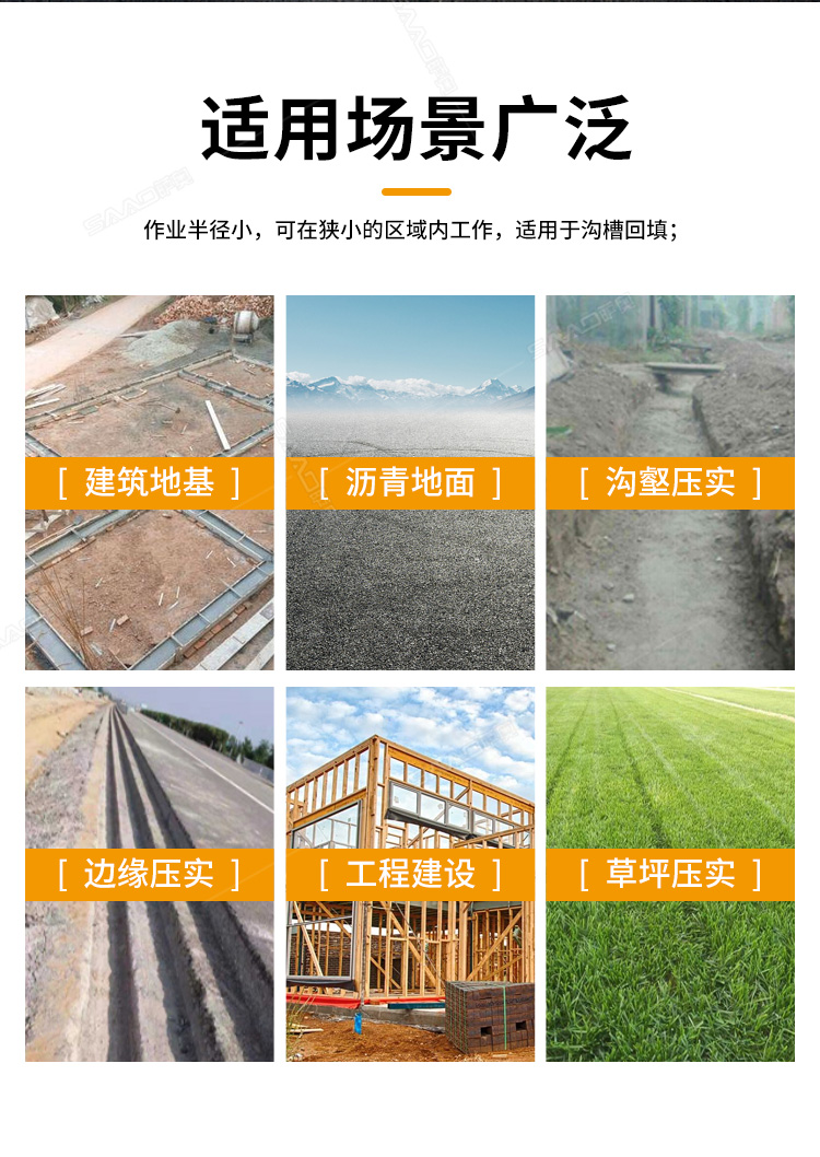 主要用于沟渠基础,道路,体育场地的压实整平,也可用于压实沥青表面的作业。