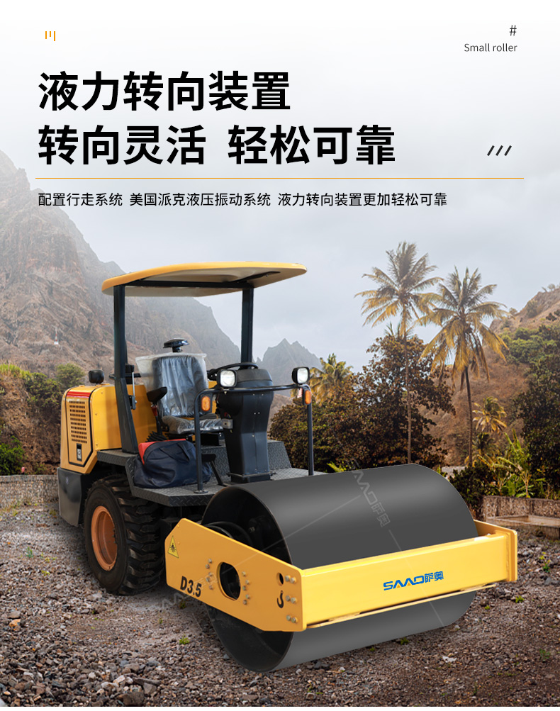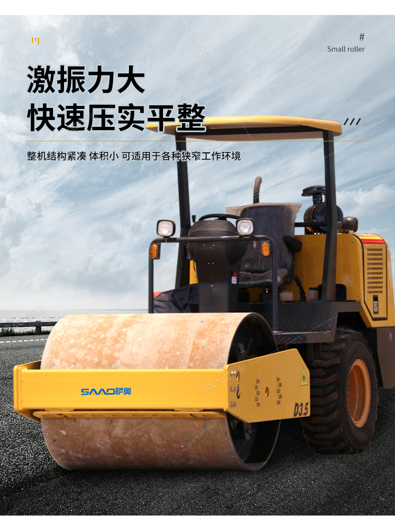 3.5吨单钢轮振动压路机适用于各种沟槽沙土回填压实、高层建筑地下室土方压实、小区道路基础压实、各种草坪压实、修修补补及各种小型工程的使用,解决了其他工程机械不能完成的